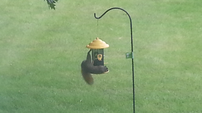 Thursday was the Invasion of Winston. Though no, “Winged Creatures Only” signs are posted, a brightly colored tube full of bird seed generally implies BIRD feeder. That idea, however, is only implied in our human world. In the world of squirrels, all that is implied is FOOD.