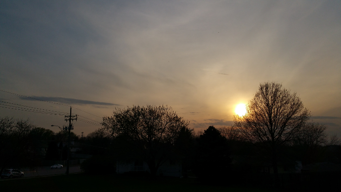 My backyard was as good as any trail I could have driven to. There were dozens of birds strutting around. One of my apple trees is beginning to blossom. There were pine cones here and there, scattered by the wind. The sun was setting beautifully into the treetops.